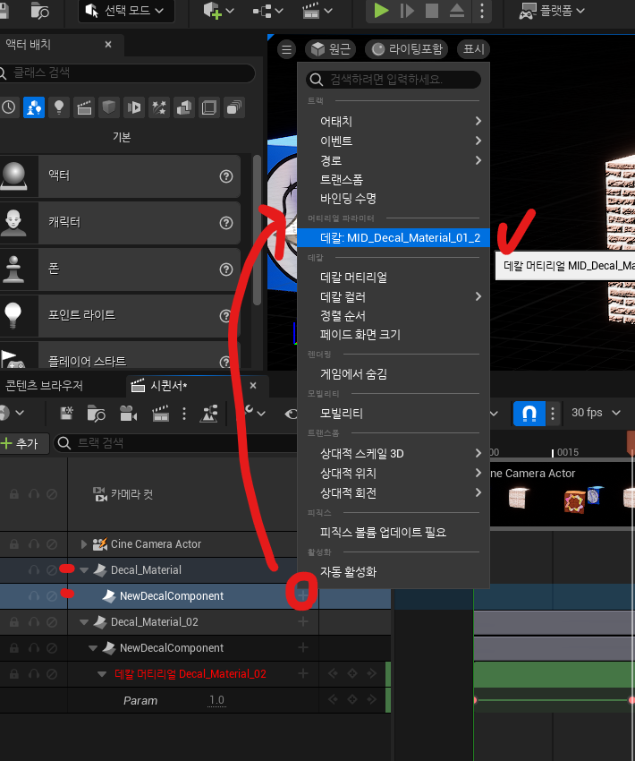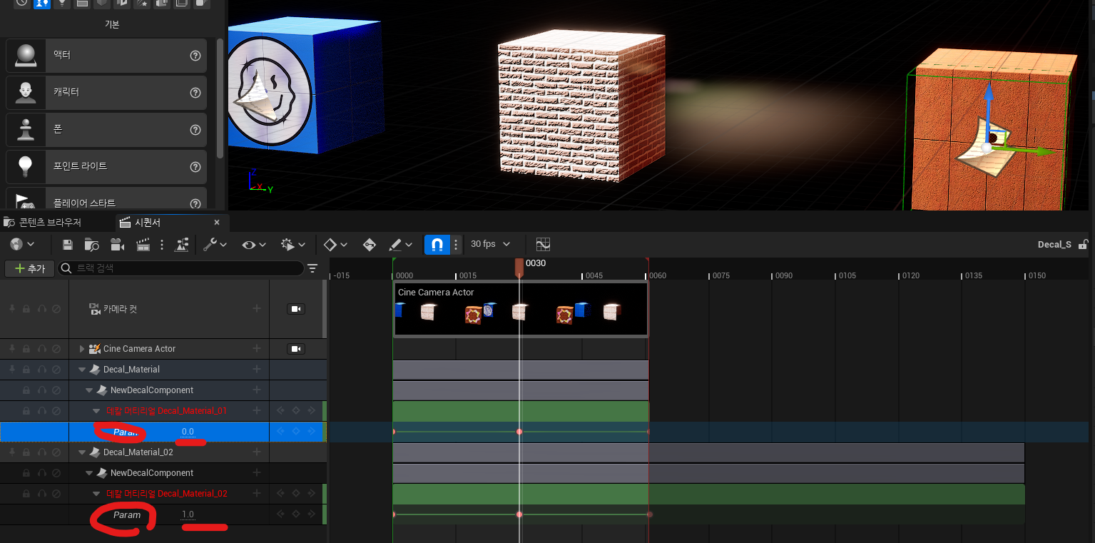 2. 시퀀스에 Decal Material + NewDecalComponent 추가 ~ 최종적으로 Param 키값 찍을수있는 창이 나온다.