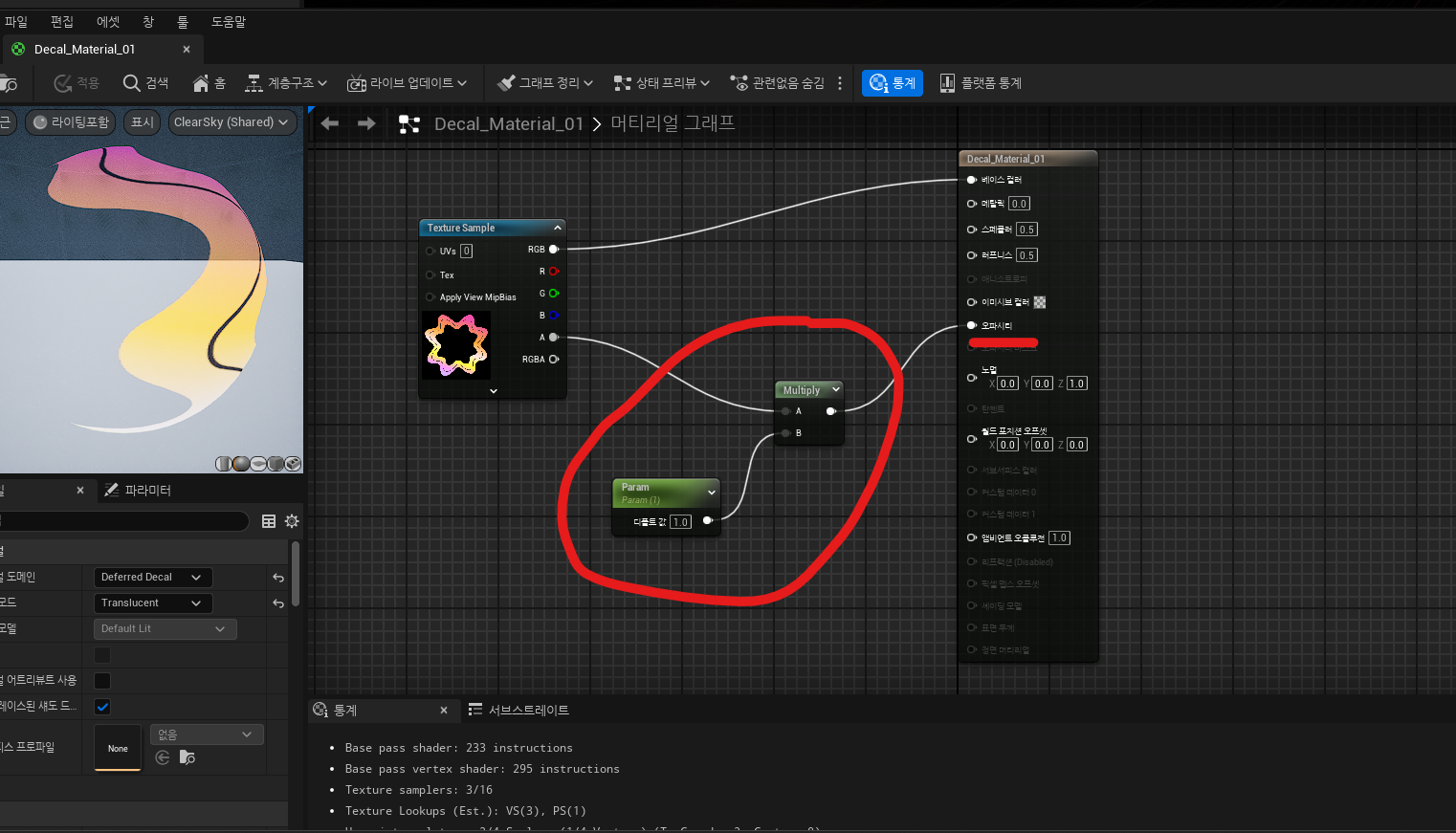 1. 이렇게 데칼 오파시티에 multiply로 parameter 노드 추가한다.