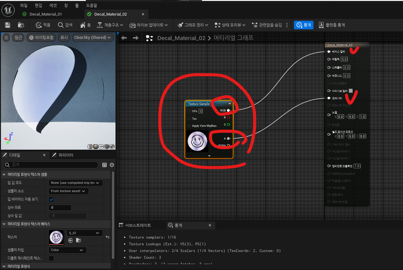 3. 원하는 데칼 텍스처 노드창으로 가져와서, RGB- 베이스컬러 / A - 오파시티에 연결시켜줌