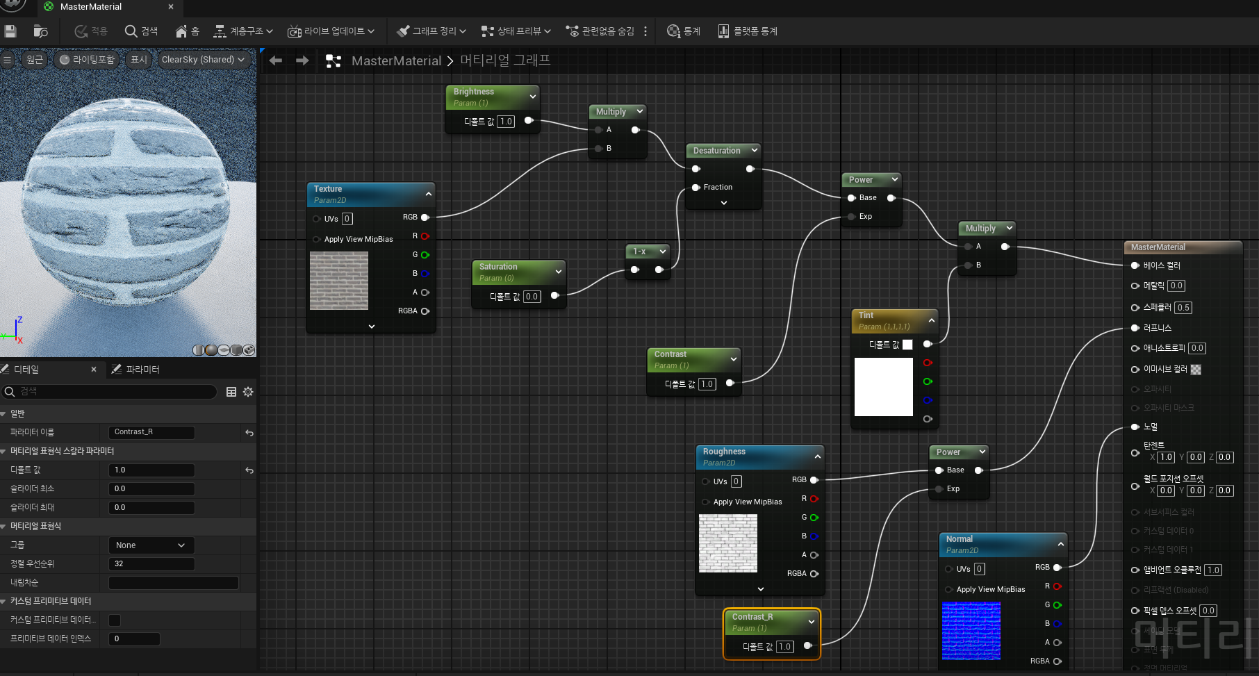 Power 만들고, ScalarParameter 만들고 파라미터로 변환 - 이름 Contrast_R(러프니스) 로 변경해준다.